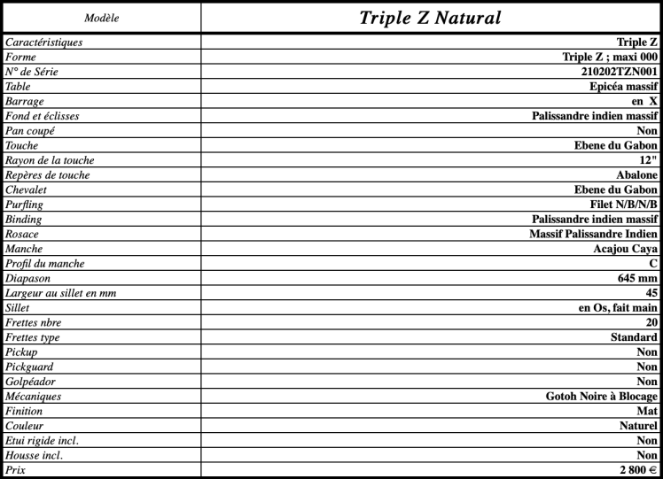 Triple Z Natural Table en épicéa massifFond et éclisses en palissandre massifManche en acajou cayaFinition mat Plus d’infos Prix : 2800 € Caractéristiques techniques Polybass Fretless Style Triple Z Pan Coupé